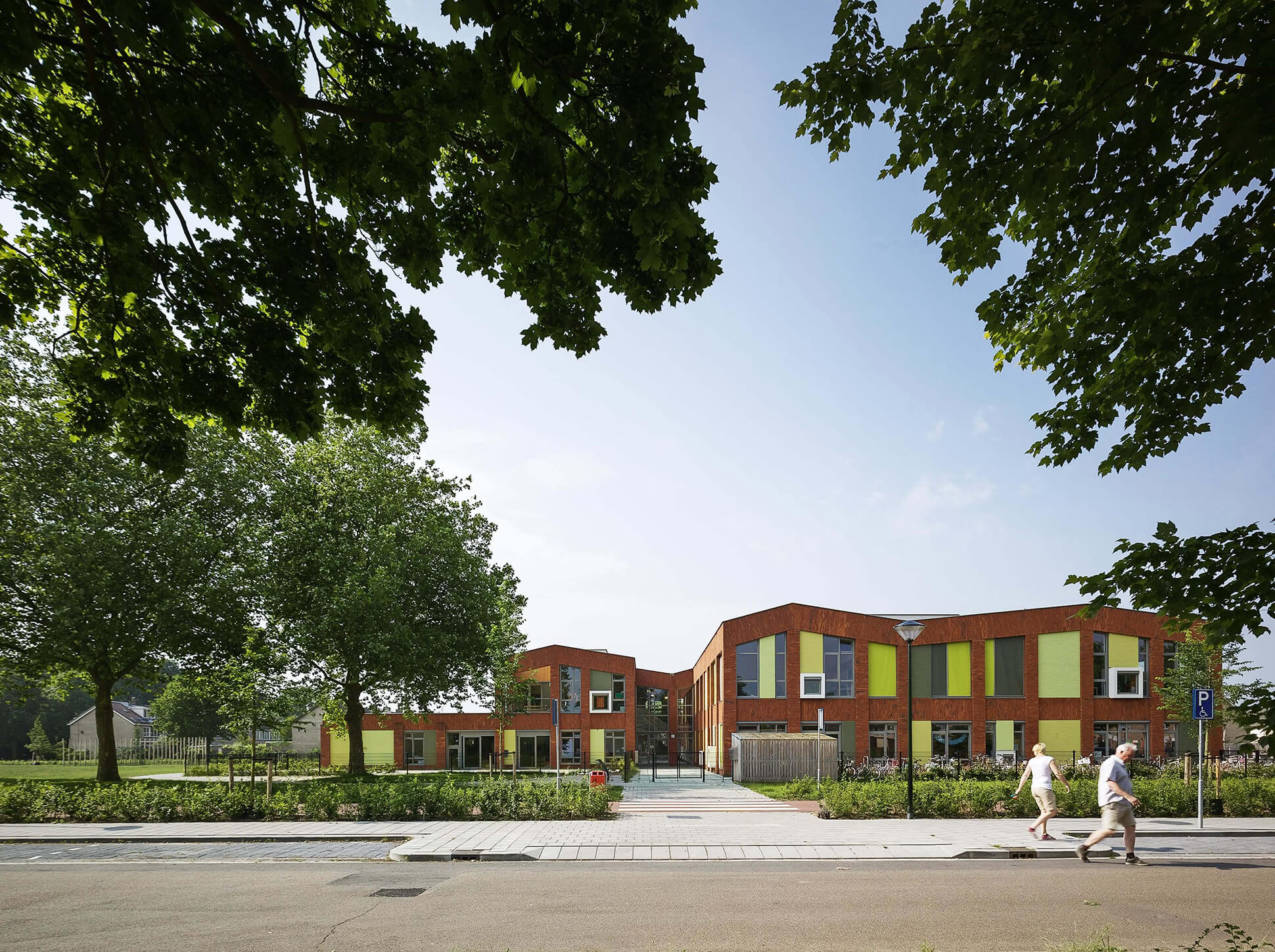 Omdat de brede school midden in het park ligt en leerlingen vanuit alle richtingen naar school komen heeft het gebouw louter voorkanten. In elke richting vormt een hoek de logische plek voor een entree. De rode baksteen gecombineerd met de groene vlakken en groene zonwering draagt bij aan de associatie van een bomenrijk park waarin kinderen leren en spelen.