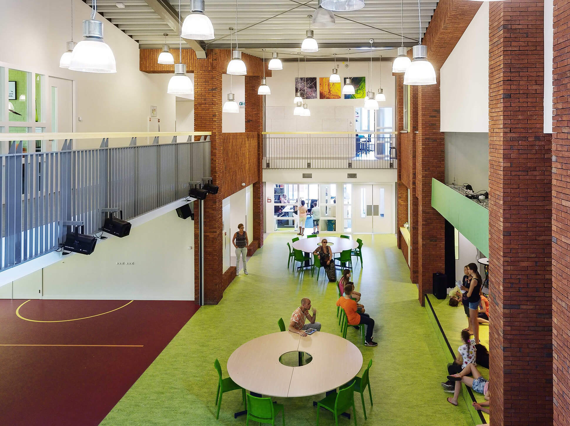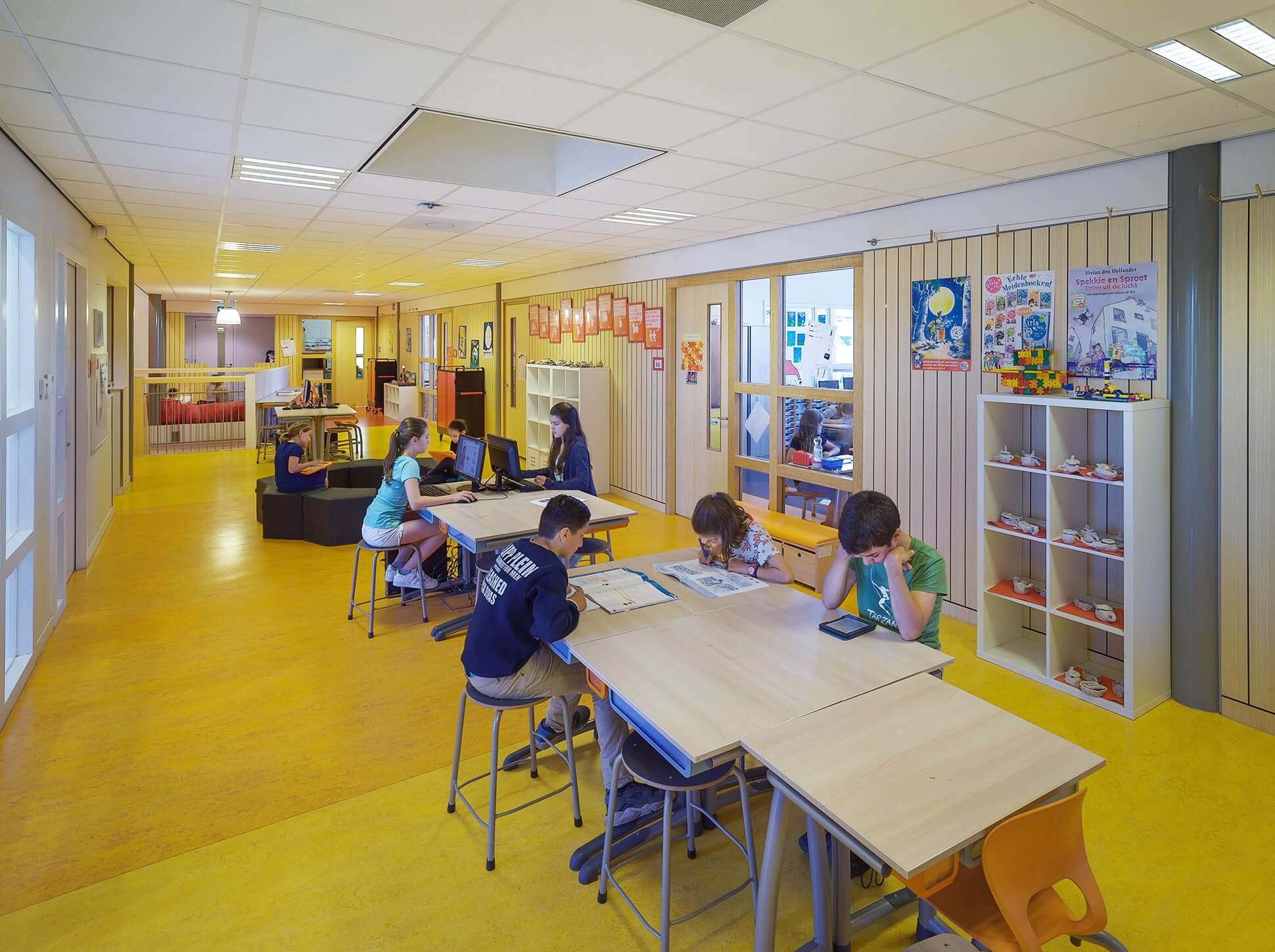 Waar het centrale deel van het gebouw de groene verbinding als thema heeft, hebben de gebruikers zelf voor de expressie en herkenbaarheid van HUN identiteit kleuren gekozen uit een herfstpalet. Zo zijn binnen het centrale thema van de school plekken met een eigen herkenbaarheid en identiteit ontstaan.