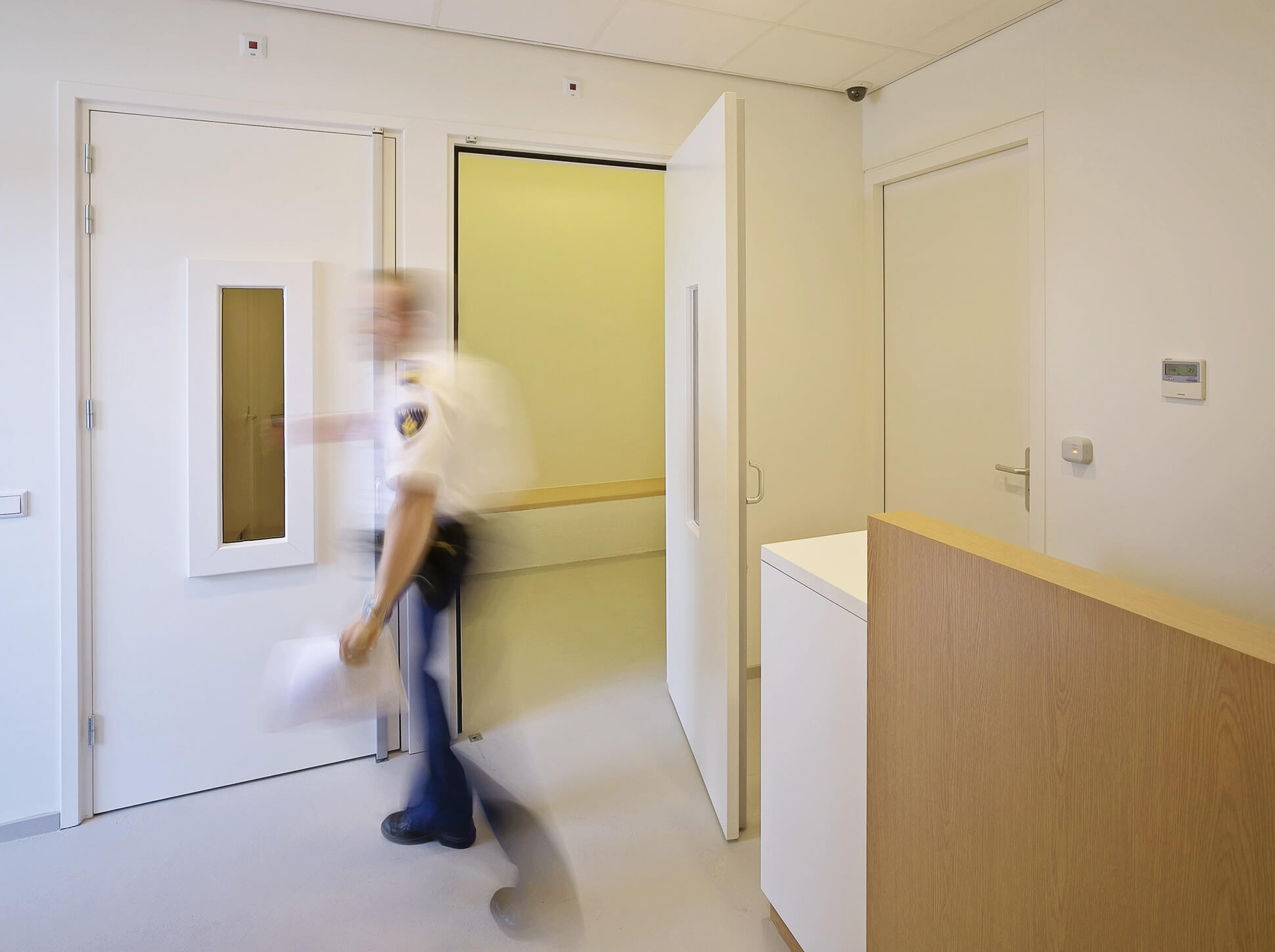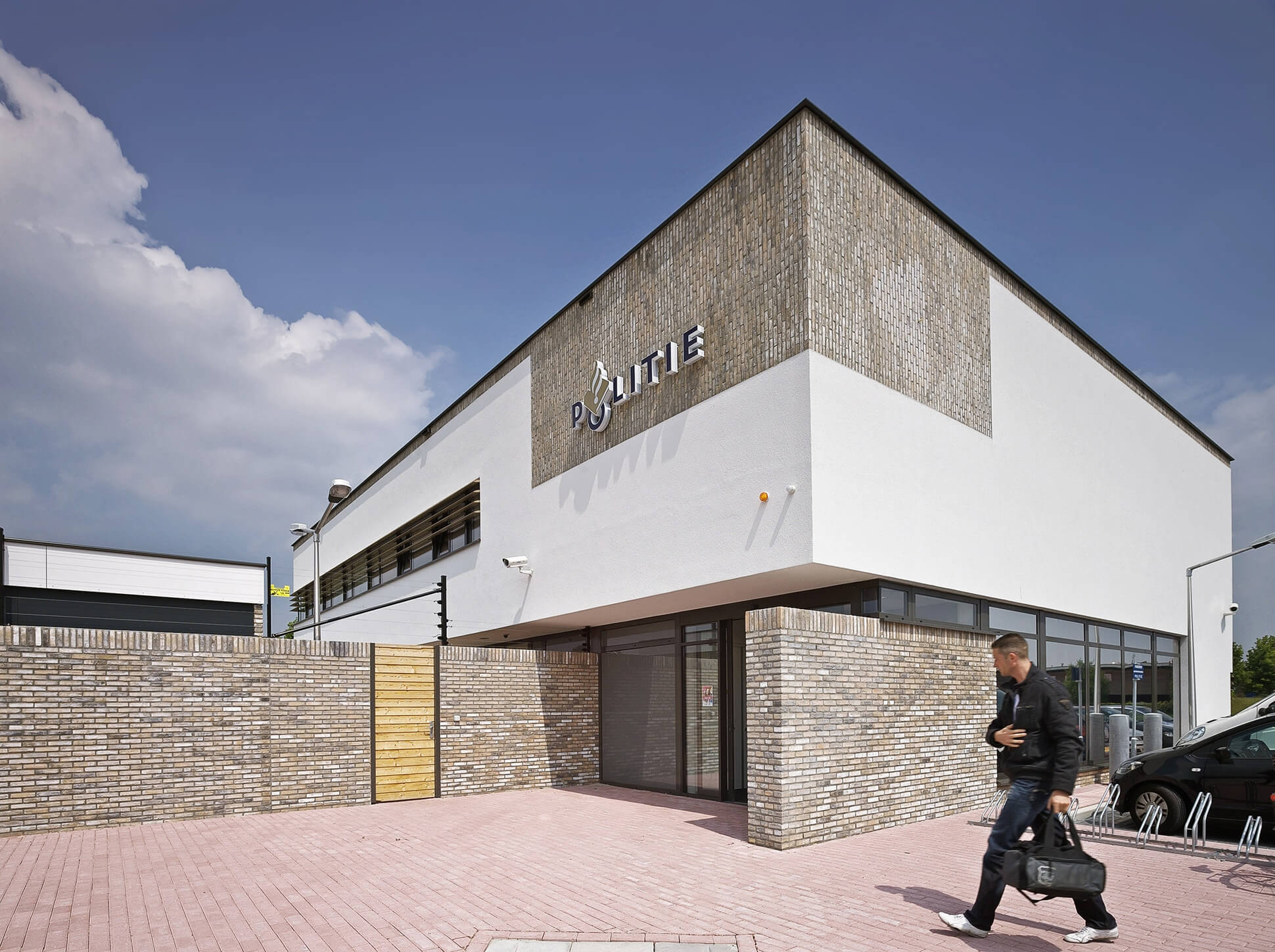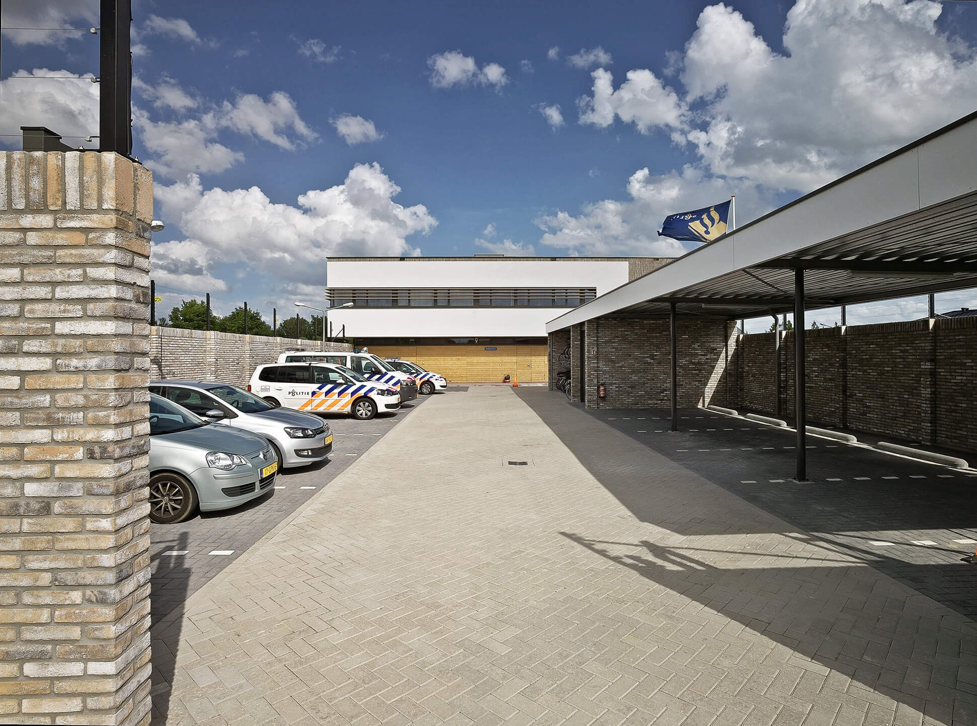 Een beschermende en afschermende rondlopende hoge muur omsluit het “beveiligd gebied”. In dit gebied valt het buitenterrein bij de politiepost waar stallingsruimte is opgenomen voor auto’s en motoren en een uitwisselingsplek voor gedetineerden. Direct aansluitend, binnen het beveiligd gebied zijn de cellen en verhoorruimten ingepast. De hoge rondlopende muur laat op één plek, aan de voorzijde een opening die transparant is ingevuld. Zo ontstaat een gebaar van welkom en een toegang tot de publieksruimte. Vanuit het beveiligd gebied en de publieksruimte is het vitale gebied op de verdieping bereikbaar. Binnen dit gebied zijn onder andere kantoren, werkplekken en spreek- en vergaderruimten gesitueerd. Het vitale gebied is vormgegeven als een bouwvolume dat op de rondlopende hoge muur ligt en uitkijkt over de omgeving. De langgerekte raamopening drukt de alertheid en waakzaamheid van de politie uit.