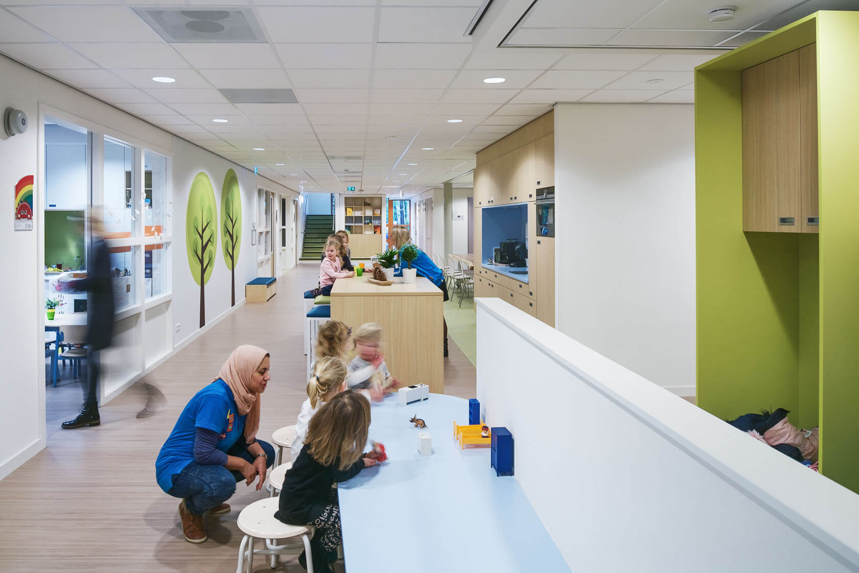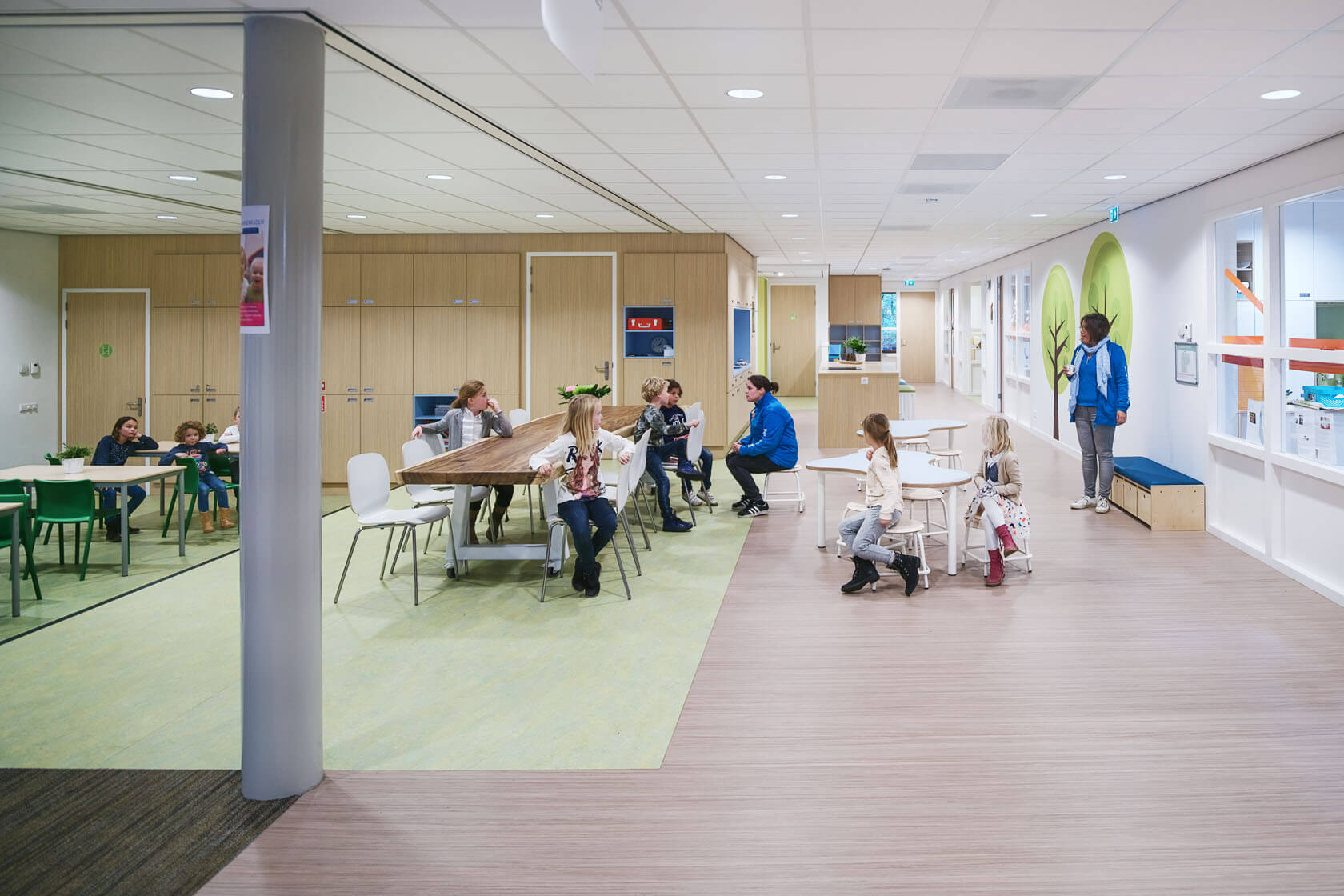 Rustig en licht kleur- en materiaalgebruik zorgt voor een rustige leeromgeving. De kleuren zijn gerelateerd aan de bosrijke omgeving waarin de school is gesitueerd.